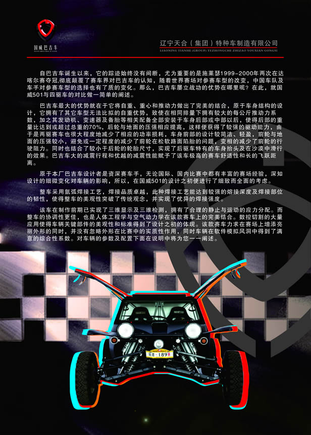 自巴吉車誕生以來,它的蹤跡始終沒有間斷,尤為重要的是施萊瑟1999-2000年兩次在達(dá)喀爾賽奪冠,徹底顛覆了賽車界對(duì)巴吉車的認(rèn)知,隨著世界賽場(chǎng)對(duì)參賽車型的改變,中國車隊(duì)及車手對(duì)參賽車型的選擇也有了質(zhì)的變化。那么,巴吉車屢立戰(zhàn)功的優(yōu)勢(shì)在哪里呢?在此,就國威501與四驅(qū)車的對(duì)比做一簡(jiǎn)單的闡述。